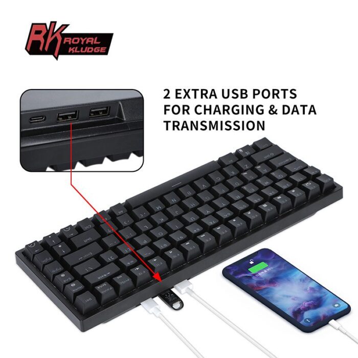 6.Hub Design – This wireless mechanical keyboard is armed with 2 built-in USB pass-through ports and 1 Type-C Port, allowing to back up more facilities