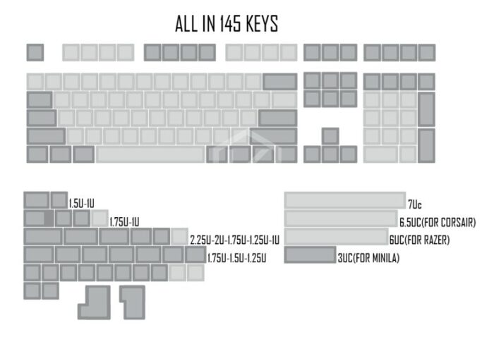 145 All in one: The whole Set,but the 6U Spacebar can't fit Cherry 18xx, it only can be used at Razer MK. “C” means Convex.