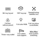 The keyboard is designed with one single connection mode: Type-C wired connection and double line design including Type-C to Type-C and Type-C to USB. It also features custom satellite axis, PBT key cap and full color backlight, all together providing a wonderful gaming experiences.