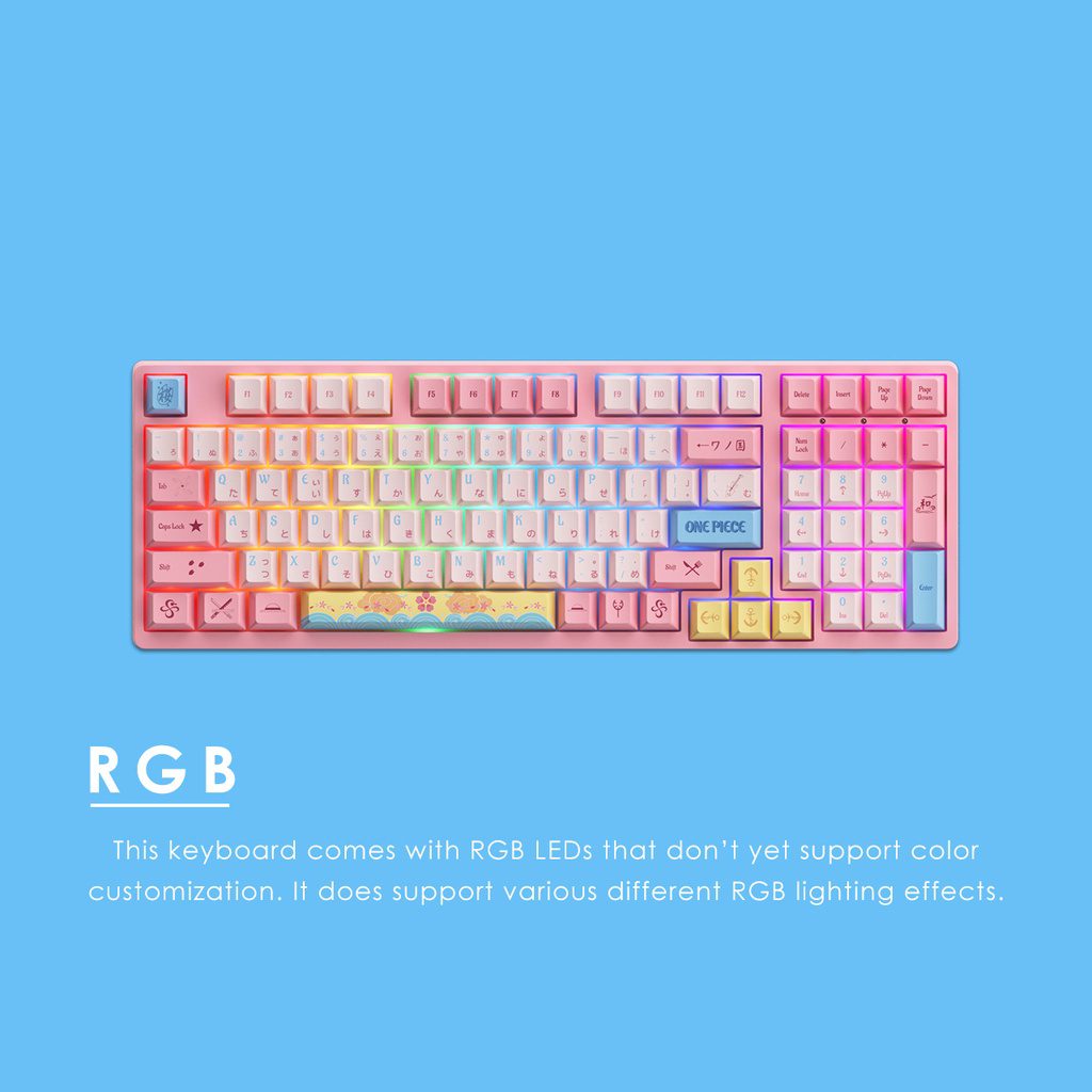 Akko 3098B is ispired by animation ONE PIECE and designed with ASA Profile Shine-through PBT Double-Shot Keycaps, 98 -key classic compact as well as hot-swappable shafts with RGB backlit. This design will enhance the sense of thrill and joy when you work or play games, especially at night. Separate Type-C Charging Port is better for storge and carrying.