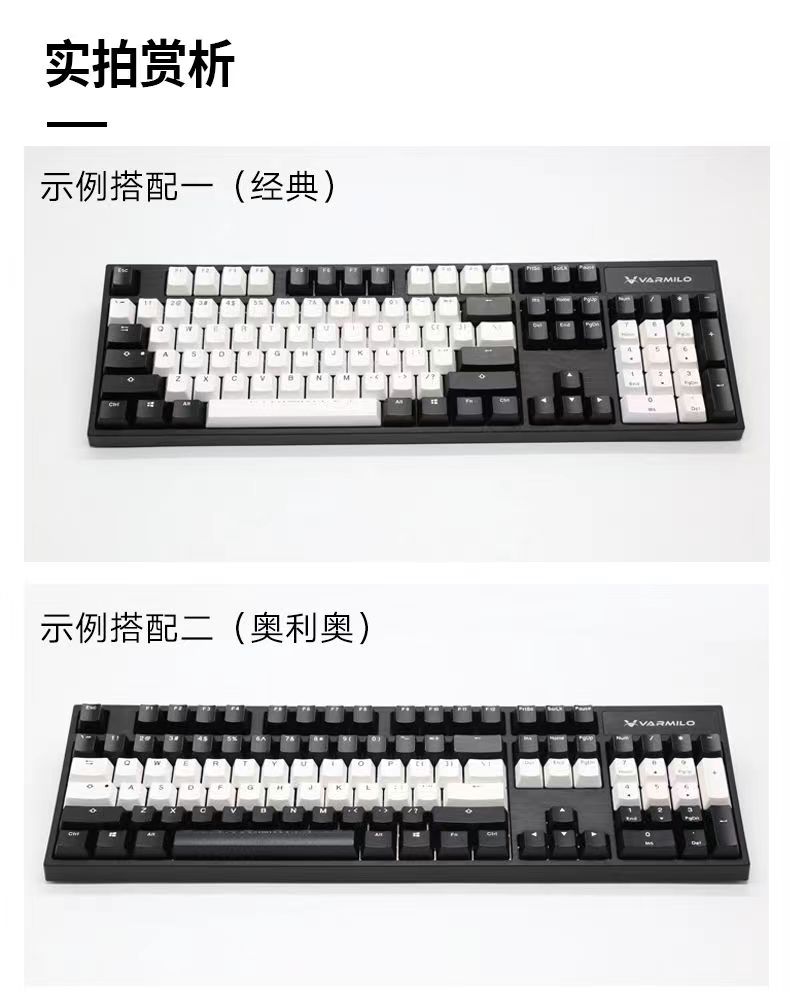 This is original Varmilo keycaps , OEM profile , ABS two color mold , suit for ANSI keyboard 61 87 104 layout . The quality is good , keycaps don’t have plastic burrs .