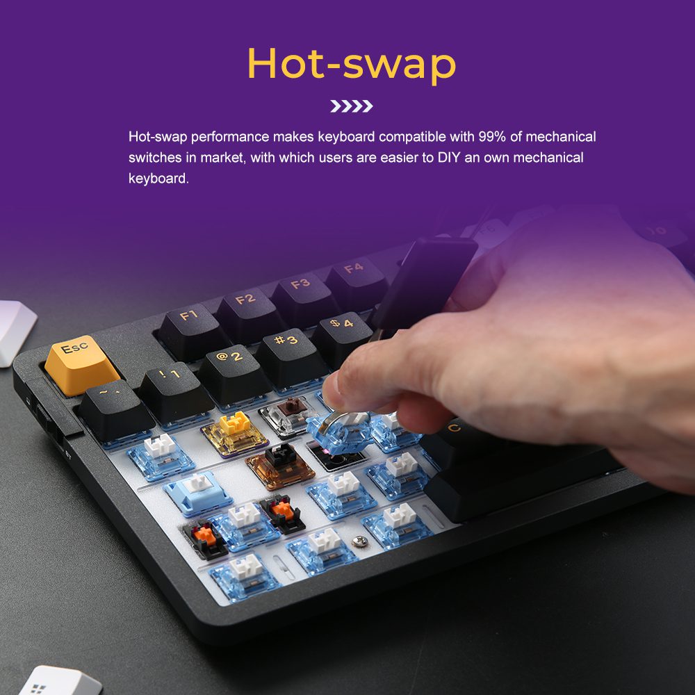 DAREU A87 Pro mechanical keyboard has a full-key hot-swappable keyboard plate. It supports the interchanging of mechanical switches with support for both 3-pin and 5-pin mechanical switches. Users can fully customize the feel of their A87 Pro by easily interchanging the switches.