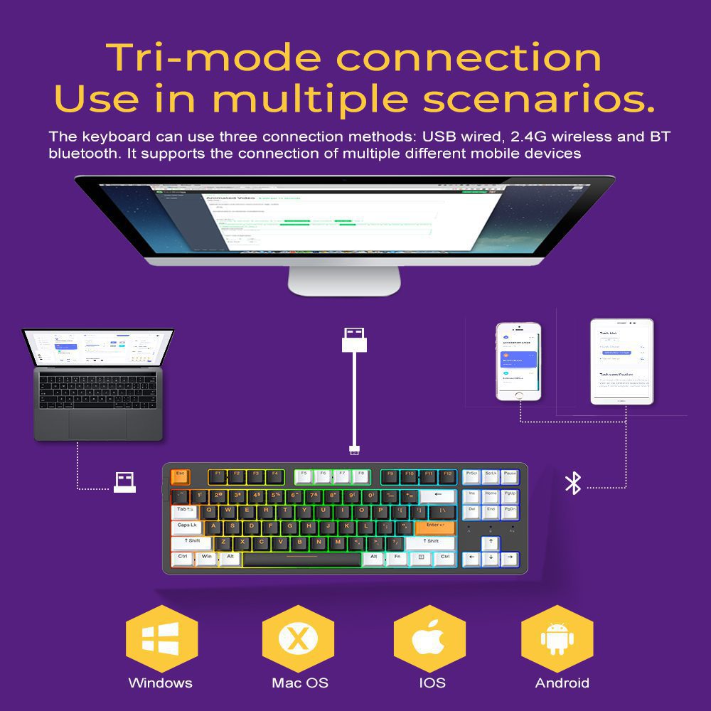 The keyboard can use three connection methods: USB wired,2.4G wireless and BT bluetooth. It supports the connection of multiple different mobile devices and can be quickly switched to different scenarios.Compatible with system devices such as Win/Mac and meets the needs of users on different platforms.
