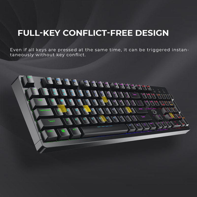 DAREU EK1280 mechanical keyboard has no ghosting or lag issues. The keyboard supports full-key conflict-free operation, you can type on the keyboard at your full typing speed and it wonโt miss any keystroke. Even if all keys are pressed at th same time, it can be triggered instantaneously without key conflict. EK1280 is a reliable help to win in millliseconds in fierce and precise e-sports.