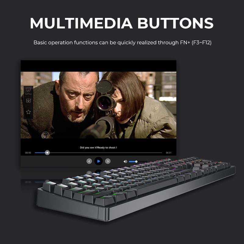 Multimedia buttons provide quick access to features like the media player, homepage, volume adjustment, etc. Basic operation functions can be quickly realizaed through pressing FN+(F3~F12). The keys cap is laser engraved, making it robust and non-fading.