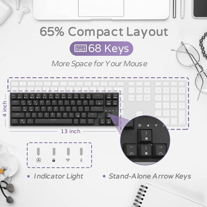 1.Mini 65% 68 Key Keyboard – This 65% mechanical keyboard can meet you demands in office or home. Whatโs more, it is equipped with individual arrow keys and indicator light which is a prefect combination of practicality and portability.