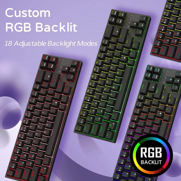 4.RGB Backlit – 18 RGB backlight modes, 8 monochrome backlight modes and 1 full color backlight. These modes will give you more enjoyable when you gaming or typing at night.