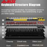 The Ajazz K870T PRO provides incredibly smooth typing with quick rebound and nice feedback because to its Gasket Mounted structural and shock-absorbing structural design. The keyboard includes the newest mechanical switches as standard equipment. Along with DIY capabilities, it has hot-swappable sockets. In addition, it also features full RGB backlighting for a dynamic ambiance.