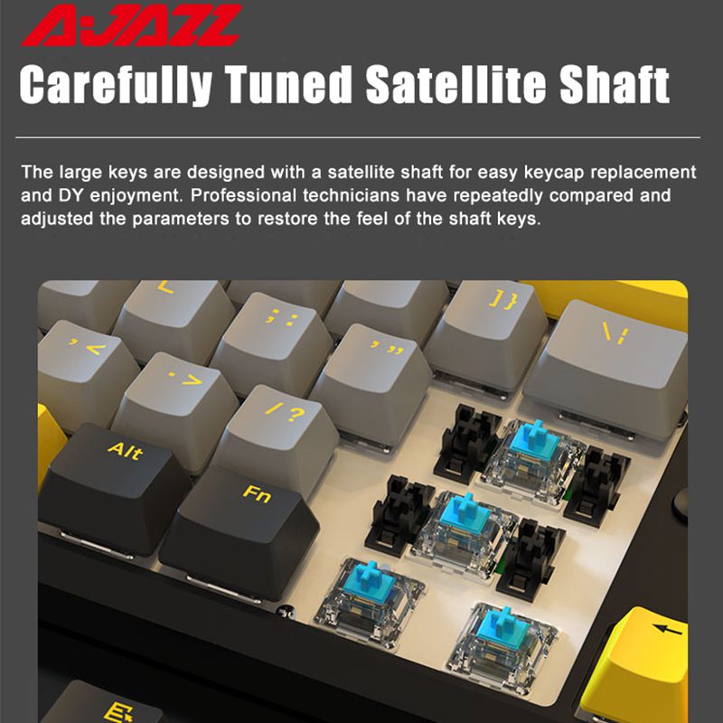 The deisgn of Ajazz K870 PRO is gorgeous and comes in two eye-catching color variations: Summer Story(pink, white and blue) and Rising Sun( black, gray and yellow). And the latter one is specially equipped with hot-swappable switches, compatible with almost 99% of the switches on the market, allowing you to change a variety of mechanical switches at will. Customize it into a mechanical keyboard that belongs to you.