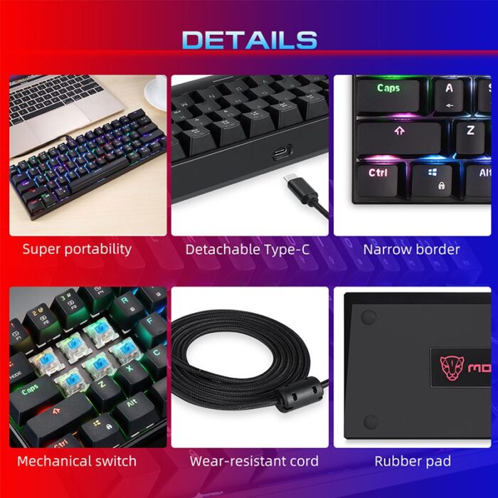 Product specifications Brand Name:MOTOSPEEDSeries Name:CK61 Key quantity: 61 keys Color: Black Keyboard material: ABS Keyboard Switch Type: Blue Switch/Red Switch Connection method: wired Keyboard Type: Gaming Mechanical Keyboard Keyboard Switch Brand: OUTEMU Connection: USB2.0 Keyboard Lifespan ( times): 800 million Response Speed: 0.1ms Anti-ghosting Number: All Cable Length (m): 1.5m±1% Product weight: 465g±20 Package weight: 615±20g Product size (L x W x H): 289.8 x99.7 x40.21mm / 11.2 x 3.5 x 0.7 inches Package size (L x W x H): 316 x 130 x 69mm / 12.4 x 5 x 2.7 inches System support:WIN2000/XP/VISTA/WIN7/WIN8/WIN10 Axis Body:Blue switch and Red switch Blue switch has paragraph sense , when you press it ,it have a “kacakaca” sound Red switch no paragraph sense, but the resilience is good, straight up straight down Product Highlights –Plug and play, do not need to install any driver, easy to use. –Humanized design, adding a series of shortcut function keys. –Ergonomics design is made for gamer, officer, etc. –Mechanical: 61 keys, built-in game chip, advanced mechanical switch technology, gives you more pleasant sensation. –Adopting professional game chip, giving you a perfect game experience Product Packing – 1 x Motospeed CK61 Mechanical Gaming Keyboard – 1 x User Manual – 1 x Keyboard Puller Remover ( gift ) ![]() ![]() ![]() ![]() ![]() ![]() ![]() ![]() ![]() ![]() ![]() ![]() ![]() ![]() ![]() ![]() ![]() ![]() ![]() ![]() ![]() ![]() ![]() ![]() ![]() ![]() ![]() ![]() |