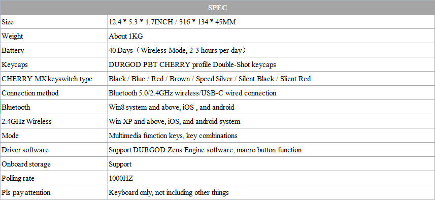 Size: 12.4 * 5.3 * 1.7INCH / 316 * 134 * 45MM Weight: About 1KG Battery: 40 Days(Wireless Mode, 2-3 hours per day) Keycaps: DURGOD PBT CHERRY profile Double-Shot keycaps CHERRY MX keyswitch type: Black / Blue / Red / Brown / Speed Silver / Silent Black / Slient Red Connection method: Bluetooth 5.0/2.4GHz wireless/USB-C wired connection Bluetooth : Win8 system and above, iOS , and android 2.4GHz Wireless : Win XP and above, iOS, and android system Mode: Multimedia function keys, key combinations Driver software: Support DURGOD Zeus Engine software, macro button function Onboard storage: Support Polling rate: 1000HZÂ